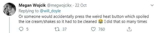 前员工Megan Wojcik说:“可能有人会意外按下加热按钮——该按钮会破坏冰激凌/奶昔,然后就必须清洁……我就这么做过很多次。”