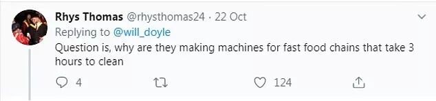 Rhys Thomas写道:“问题是,为什么他们要制造需要3个小时才能清洁的快餐链机器。”