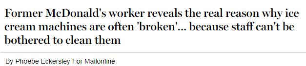 一位前麦当劳的员工透露,来麦当劳购买冰激凌的顾客常常会被告知“冰激凌机坏掉了”,其实是因为工作人员正在清洗机器。