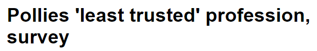但在澳大利亚,排在最后一名的是民意调查者和广告业高管,只有不到10%的受访者认为他们值得信赖。