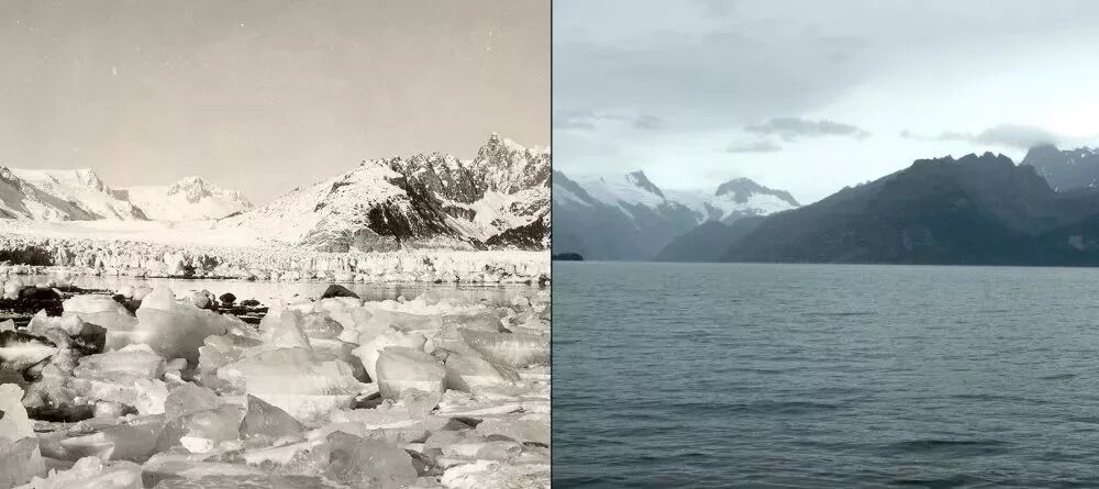 冰川已经迅速后退,原本冰雪覆盖的峡谷30年后已经变成了一片汪洋。