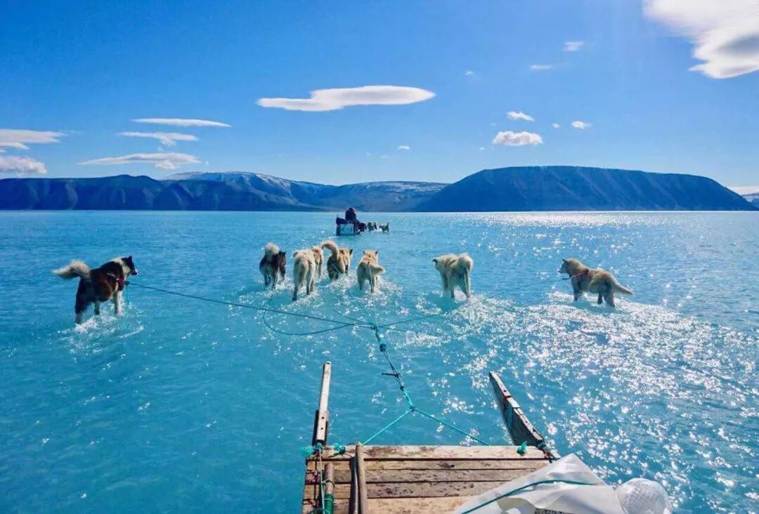 融水在冰面上形成浅湖,一群雪橇犬无雪可滑,
