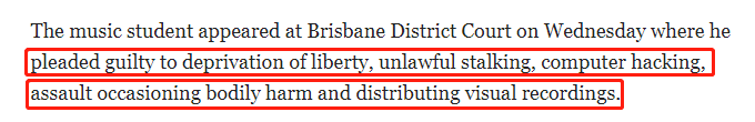 本周三(11月13日),王某在布里斯班地方法庭,对于剥夺他人自由,非法跟踪,计算机黑客入侵,殴打造成人身伤害,传播视频影响指控表示认罪。