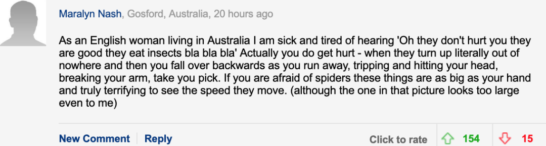作为一个在土澳生活的英国人,我听腻了那些所谓的“蜘蛛无害论”!当你看见这些巨型怪物的时候,在逃跑的过程中往往容易摔一跟头!