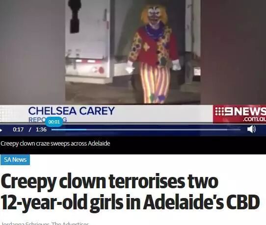 在阿德Pulteney streets和Rundle streets的交叉口,就有两名12岁的女孩看到了恐怖小丑。其中一名女孩还受到了攻击