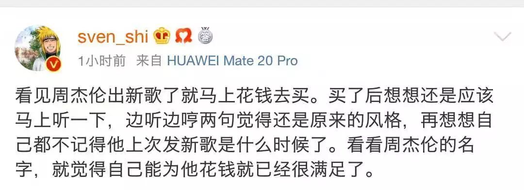 不过,如果你认为我会在这里骂周杰伦骗钱,粉丝弱智,那你就错了。听歌,尤其是听流行音乐,欣赏艺术水平只是一部分,更多的是找到情感的共鸣。